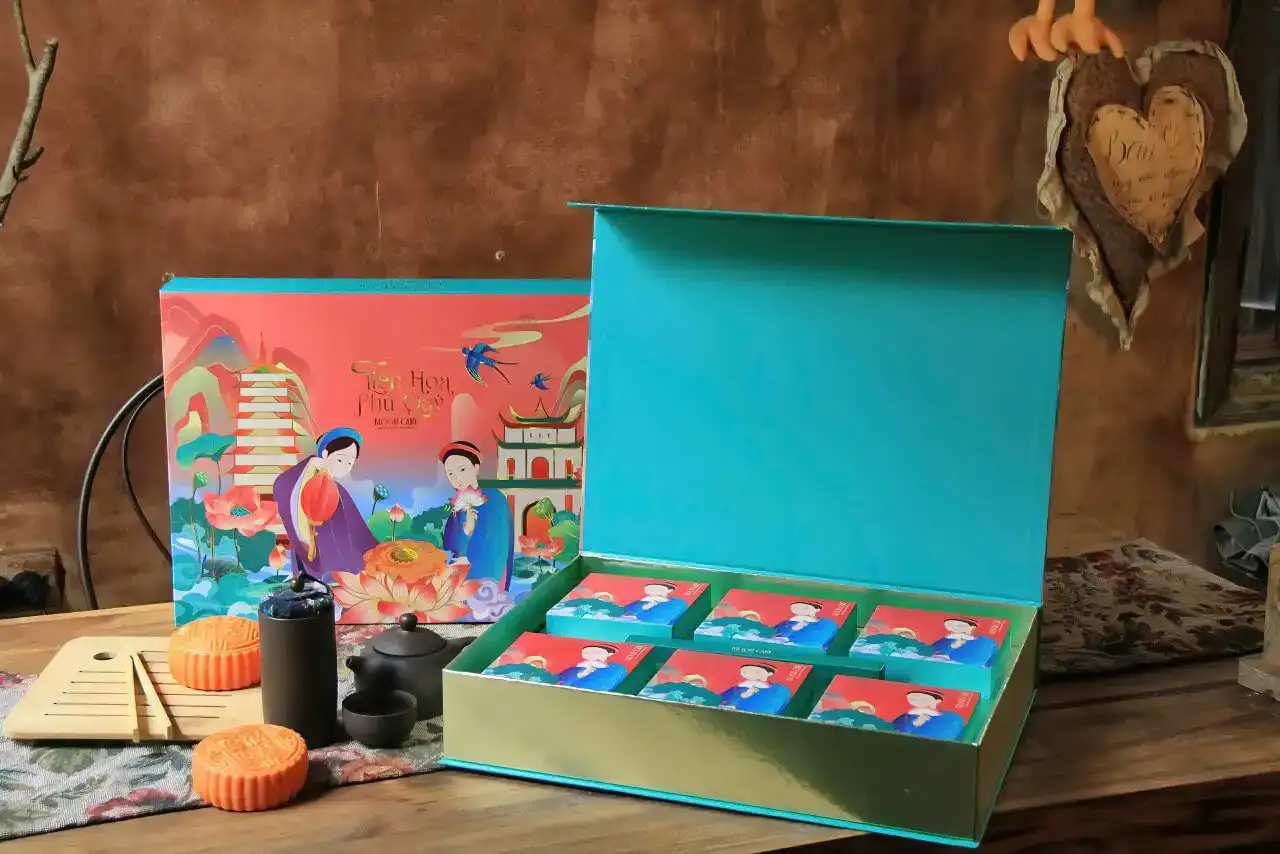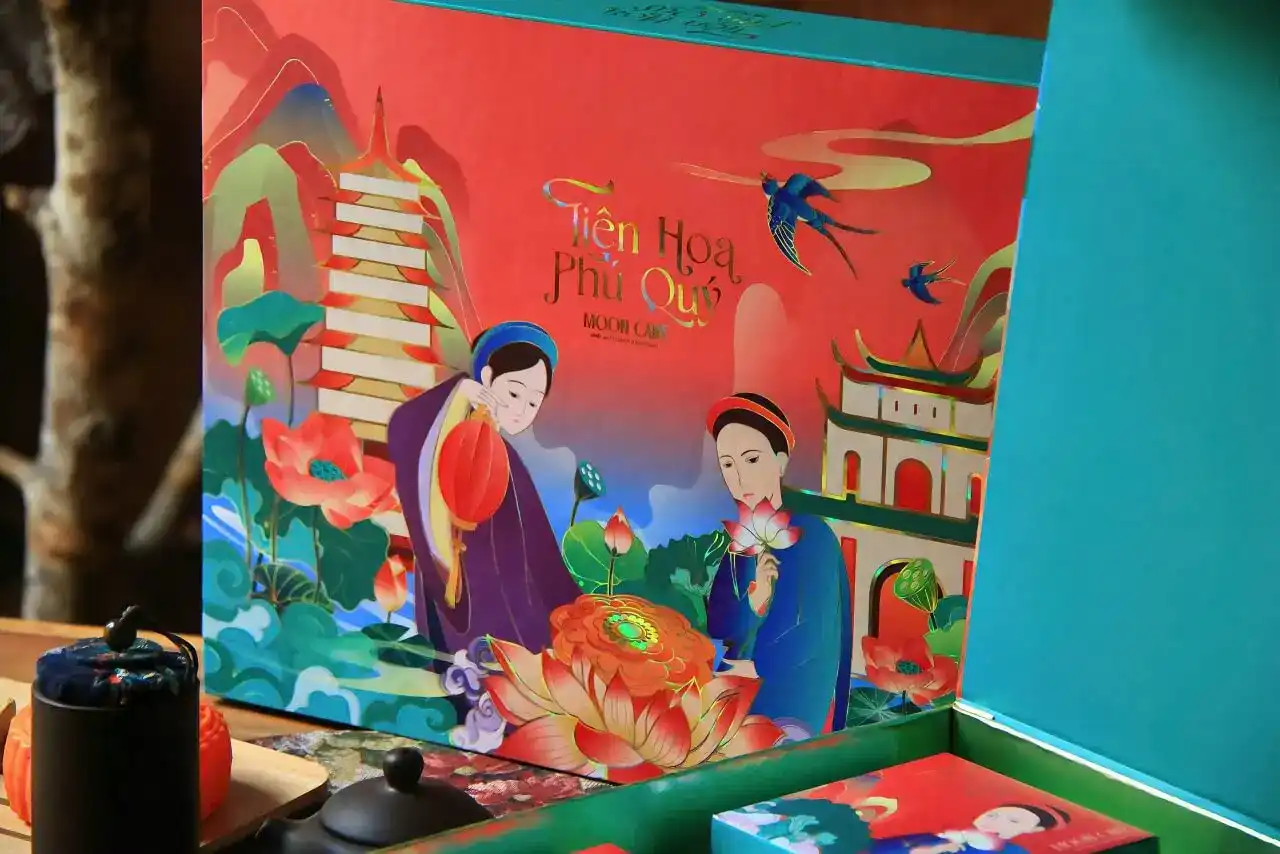 “Tiên Hoa – Phú Quý” là món quà Trung Thu tinh tế, mang đậm dấu ấn văn hóa truyền thống kết hợp cùng nét hiện đại sang trọng. Thiết kế hộp với hình ảnh thiếu nữ duyên dáng trong tà áo dài bên hoa sen – biểu tượng cho sự thanh cao và thuần khiết, được thể hiện một cách tinh xảo trên nền sắc đỏ ngọc và xanh ngọc, tượng trưng cho may mắn, thịnh vượng và phú quý. Không chỉ là một hộp bánh, “Tiên Hoa – Phú Quý” còn là lời chúc ý nghĩa gửi trao trong mùa đoàn viên – chúc bình an, viên mãn và sum vầy đến những người thân yêu, bạn bè hay đối tác quan trọng.