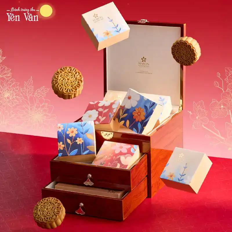 Bánh trung thu Maison 2025 hộp Cuốn Hút 1 trong bộ sưu tập Sắc Hoa Thịnh Vượng thực sự là một sản phẩm nghệ thuật độc đáo, từ thiết kế đến cảm xúc mà nó mang lại. Sự kết hợp giữa gỗ tự nhiên với lớp sơn mài nâu đỏ không chỉ tạo nên một vẻ đẹp cổ điển và thanh lịch mà còn đánh dấu sự tỉ mỉ và chu đáo trong từng chi tiết.