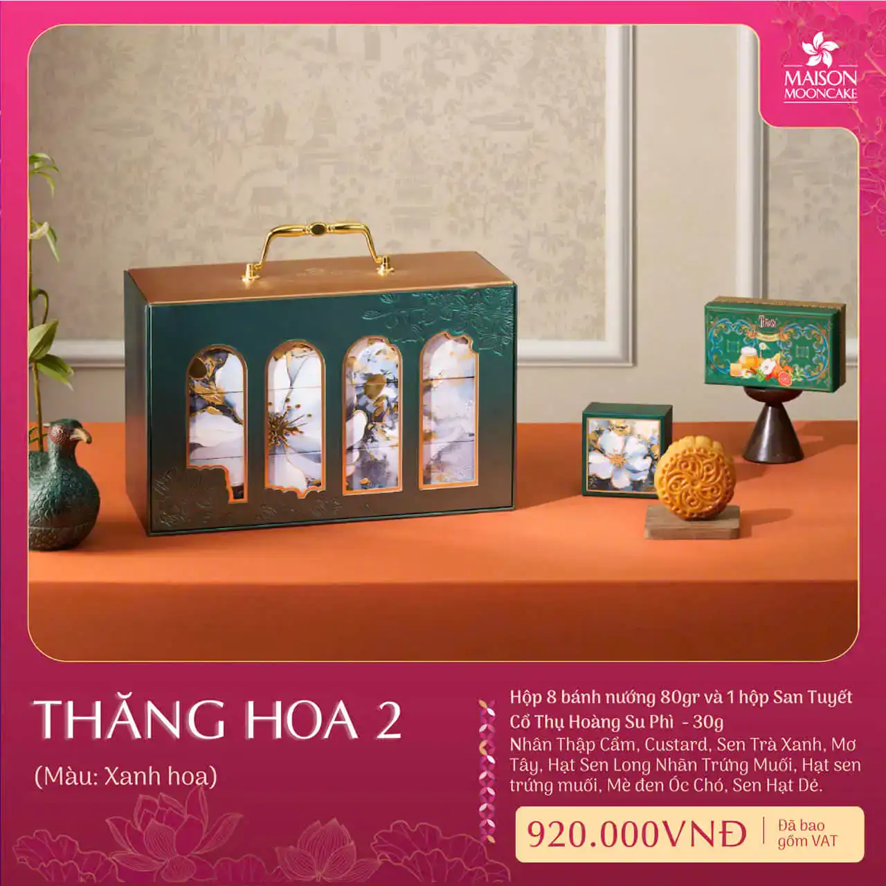 Hộp bánh trung thu Maison 2025 hộp Thăng Hoa 2 gồm 1 Trà San Tuyết cổ thụ Hoàng Su Phì 30gr & 8 bánh nướng x 80gram và với các vị nhân bánh: